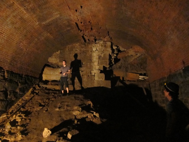 With the actors leading the audience by flashlight, the play unfolds down the entire length of the tunnel. Long, deep and slow moving wedges of sound slowly rise and follow the audience as they move towards a dead end. In setting and adjusting sound levels I would leave the mixer station and walk halfway down the tunnel, only to discover that volume level of the music was not changing at all. Higher frequency content would naturally disappear with distance, leaving only a juggernaut of low end to continue soaring down through the tunnel. Speaking and Ciara Adam’s singing at one end of the tunnel were clearly audible at the other end. We hardly needed amplification at all.