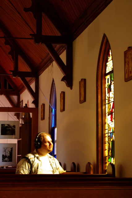 Presented at St. Andrew-by-the-Lake Anglican Church, Toronto Island in 2005, this immersive listening experience considers the impact of the city soundscape on physical memory and perception from the quiet solitude and sanctuary of an island church pew. A single pair of headphones rest on a church pew, fed by a direct audio signal from binaural microphones affixed to the underside of the pew. The signal is fed to the headphones through a custom-built software program (built in MaxMSP) that simulates hearing loss, applying specially-designed filters and synthesized simulations of tinnitus to the signal. As this simulation eventually recedes, portions of the microphone’s signal are then delayed and looped, producing an experience whereby sight and sound gradually become unsynchronized.